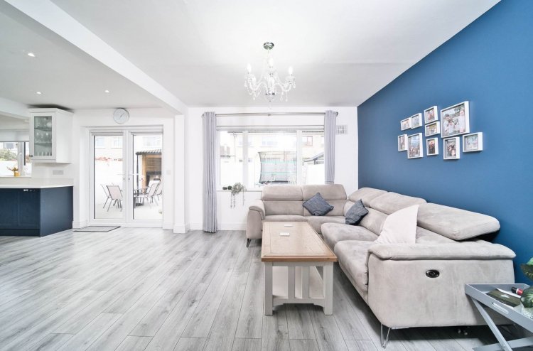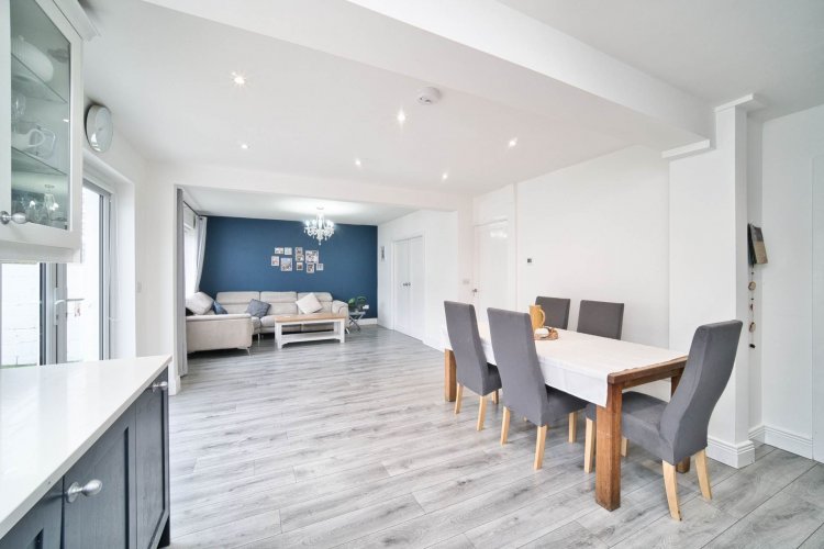 Living Room 3.38m x 5.25m Laminate wood flooring, bay window, curtains, blinds, light fitting TV point, underfloor heating and pocket doors leading into the kitchen.