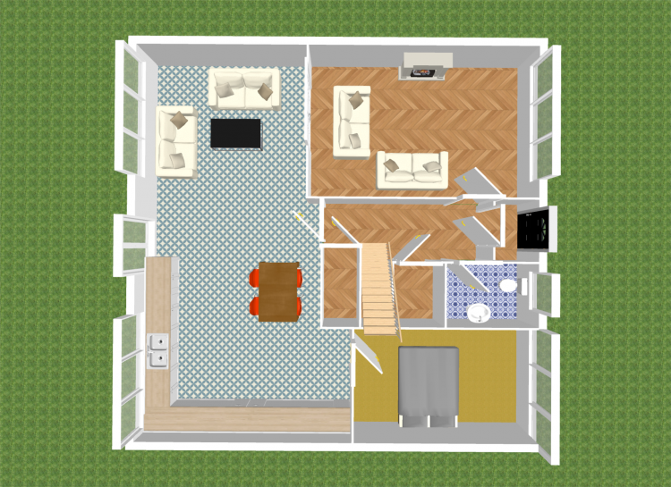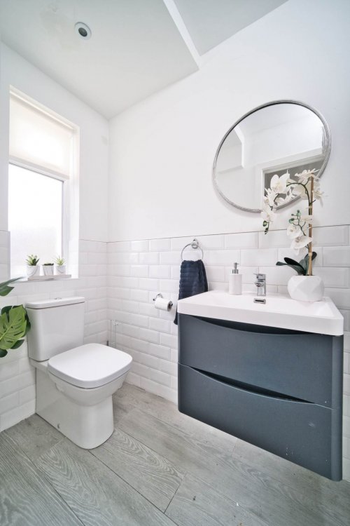 Guest W.C. 1.15m x 1.9m Tiled flooring, half tiled walls, w.c. w.h.b. with built in vanity unit, recessed lights, underfloor heating and blind on window.