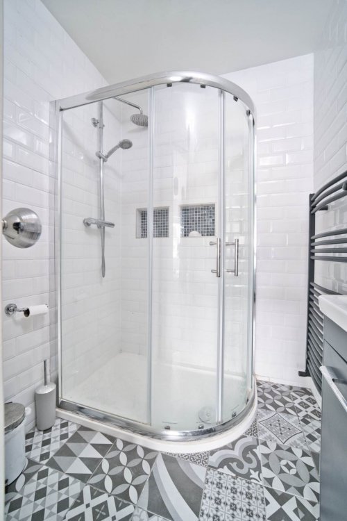 Ensuite 174m x 1.87m Fully tiled, oversized shower cubicle with monsoon shower head, integrated shelving, w.c., w.h.b. with built in vanity unit, vertical heated towel rail, extractor fan and light fitting.