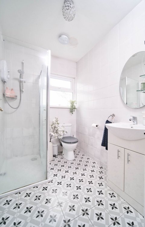 Bathroom 2.12m x 1.66m Fully tiled, fully tiled, oversized shower cubicle with electric Mira Elite Qt shower, integrated toiletries shelving in shower, w.c., w.h.b. with built in vanity unit, radiator, fitted mirror, extractor fan and light fitting.