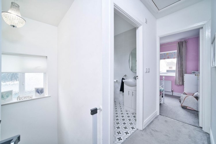 Landing 0.95m x 3.45m Carpet, attic access via folding ladder, hot-press and light fitting.