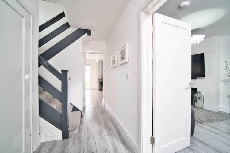 Entrance Hallway 3.82m x 1.5m Laminate flooring, recessed lights and storage/utility area.