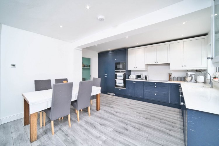 Kitchen/Dining 4.03m x 8.84m Laminate flooring, two tone shaker style fitted wall and floor units, quartz worktop with upstand, integrated sink with drainer, double oven, microwave, hob, extractor fan, dishwasher, fridge-freezer, light fitting, recessed lights and underfloor heating.