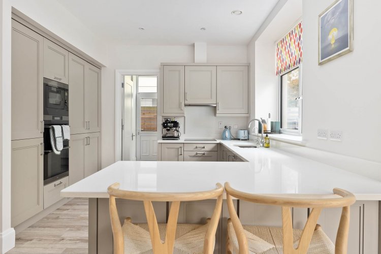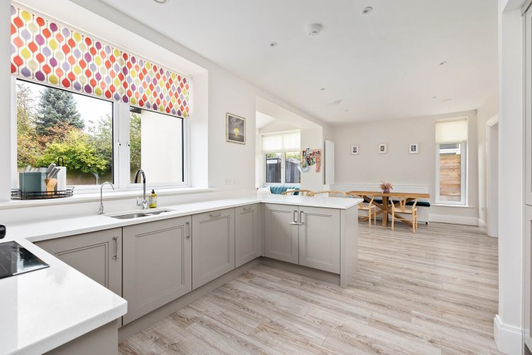 Kitchen 3.51m x 3.6m Laminate wood flooring, shaker style fitted wall and floor units, quartz worktops with integrated sink drainer and upstands, integrated AEG double oven, AEG induction hob, extractor fan, integrated AEG microwave, fridge freezer, dishwasher, recessed lights, blinds, bespoke integrated bench and vertical radiator.