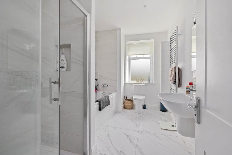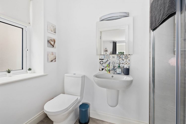 Bathroom 3.65m x 2.22m Tiled flooring, semi tiled wall, bath, seperate shower cubicle with sliding door, integrated toiletries shelf, w.c., w.h.b., fitted mirror, shaving light and window with blind.
