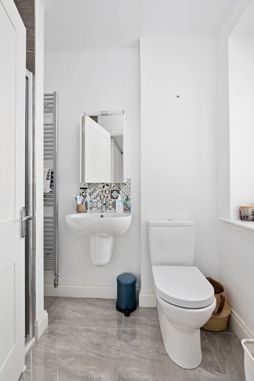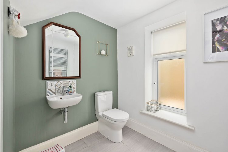 Guest W.C. 1.84m x 2.16m Tiled flooring, w.c., w.h.b., light fitting, vertical heated towel rail and window with blind.