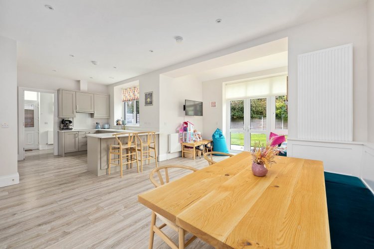 Dining/Living Area 5.83m x 4.2m Laminate wood flooring, recessed lights, blinds, light shades and double doors leading out to rear garden.