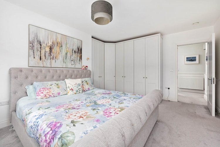 Master Bedroom 4.64m x 3.92m Overlooking front garden Carpet, extensive fitted wardrobes, curtains blinds and light shade.