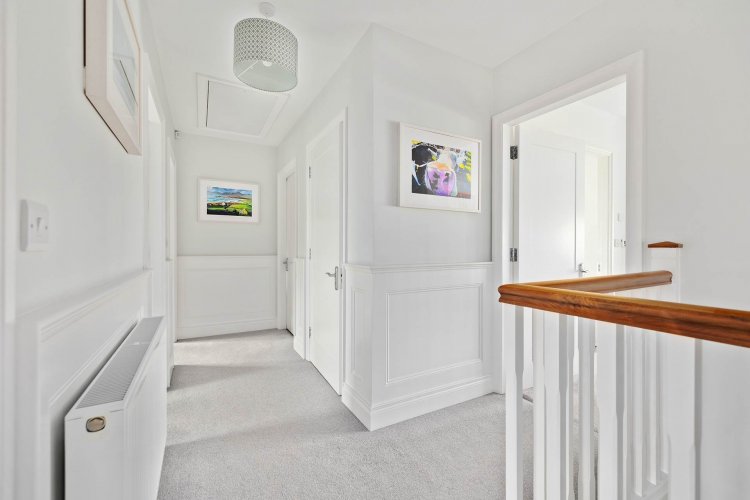 Entrance Hallway (4.74m x 1.6m) + (2.36m x 2.22m) Laminate flooring, coving, half panelled walls, under stair storage with drawers, radiator cover, alarm panel and two light shades.