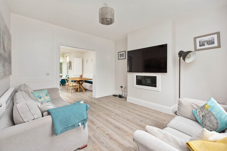 Lounge/TV Room 3.93m x 4.57m Laminate wood flooring, light shade, blinds, integrated electric fire, TV point and pocket doors leading into dining area.