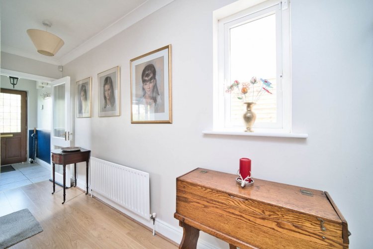 Entrance Hallway (6.58m) x (1.04m) + (1.85m x 1.41m) Tiled entrance, laminate flooring in passage, two light fittings, , under stair storage and alarm panel.