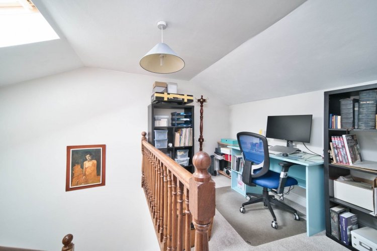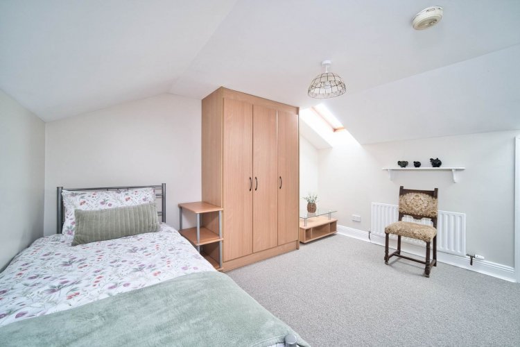 Attic Room 6m x 3.85m Carpet, eaves storage, fitted wardrobes, two Velux windows with blinds.