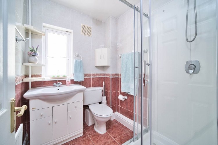 Ensuite 1.97m x 1.67m Fully tiled, shower cubicle with power shower, w.c., w.h.b with built in vanity unit, light fitting and radiator.
