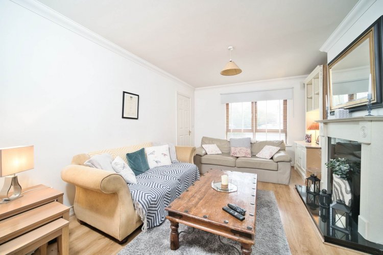 Living Room 4.85m x 3.57m Laminate flooring, feature fireplace with granite hearth, TV point, coving, light fitting, curtains, blinds and double doors leading into kitchen.