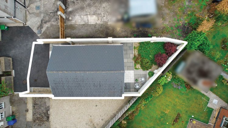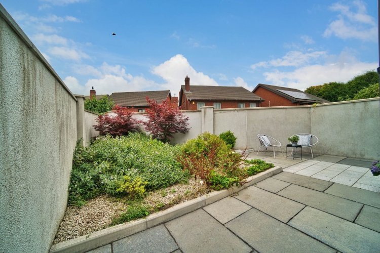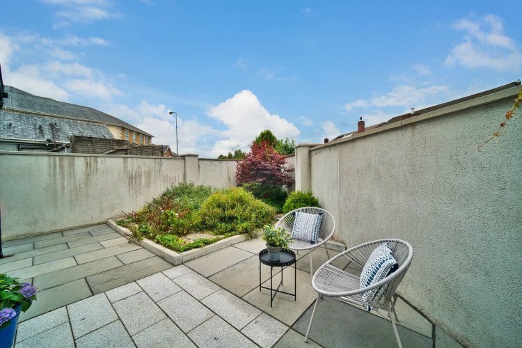 Garden Granite patio area, tall wall surround, attractively planted bed with specimen Acer & shrubs and gated side passage for bins.