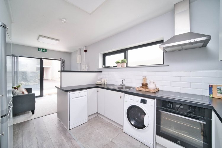 Kitchen/Dining/Living Room 2.85m x 6.20m Full height glass front door and window, privacy blind. Open plan, tiled floor defining kitchen area, fully fitted kitchen, built-under oven, electric hob, extractor fan, stainless steel sink, splashback tiles, dishwasher, washing machine, breakfast bar area, freestanding fridge built into tall larder/storage units. Semi-solid flooring in living area - overlooking front.
